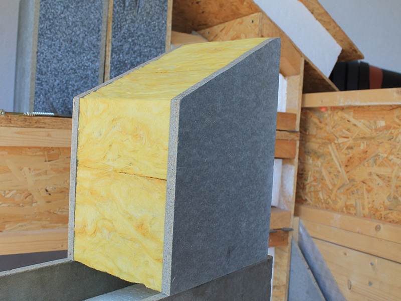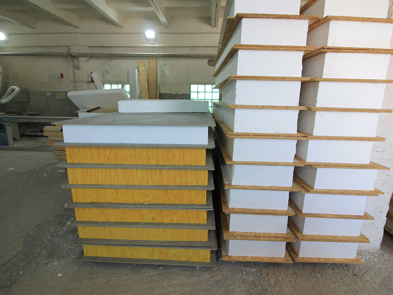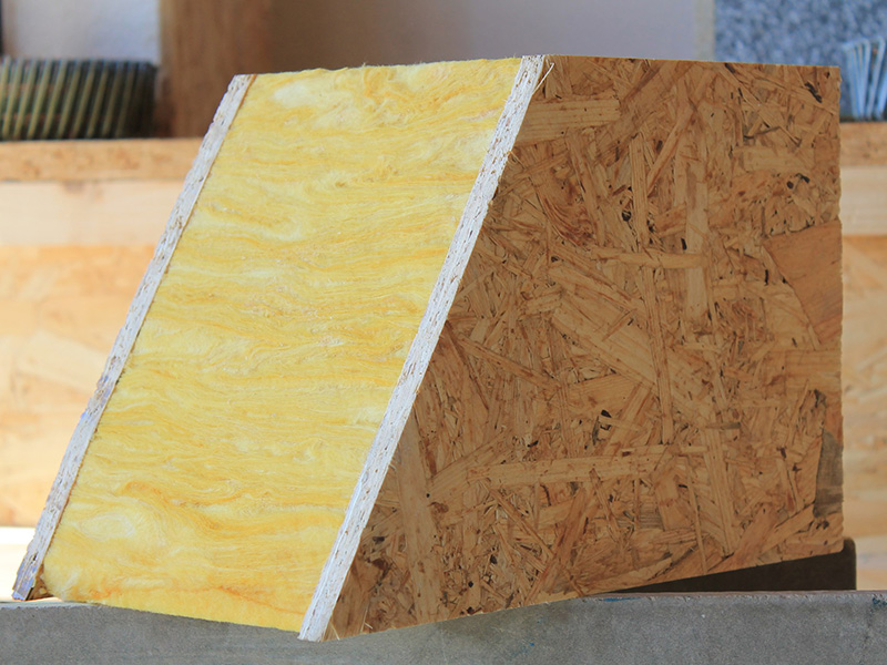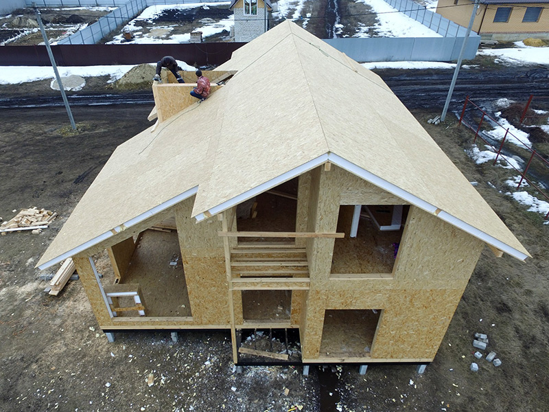 Панели склеиваются из двух ориентированно-стружечных плит (ОСП) и утеплителя между ними. Стыки между плитами плотно герметизируются в процессе возведения дома.